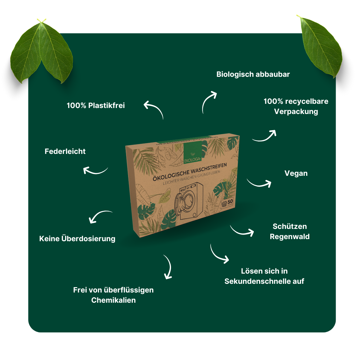 Mit Ekologa erlebst du eine neue Art zu Waschen, die nicht nur effektiv, sondern auch umweltbewusst ist. Unsere innovativen Streifen bieten nicht nur eine revolutionäre Alternative zu herkömmlichen Waschmitteln, sondern auch zahlreiche Vorteile für Mensch und Umwelt. Entdecke die Zukunft des Waschens und erlebe, wie einfach Nachhaltigkeit sein kann!